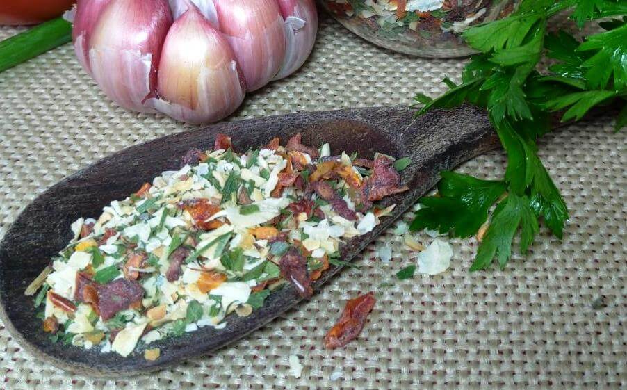 Mix de flocos desidratados de alho, cebola, tomate, cebolinha verde e salsinha. 100% natural, sem conservantes.